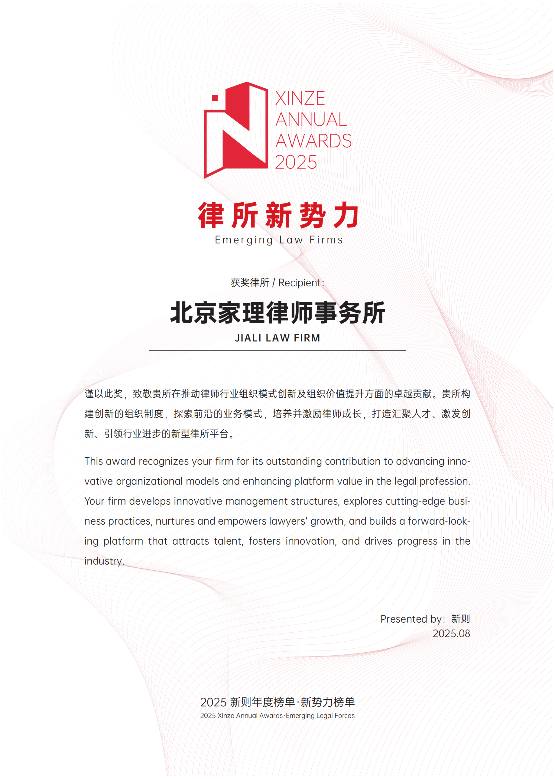 家理律师事务所荣膺2025新则“律所新势力”称号